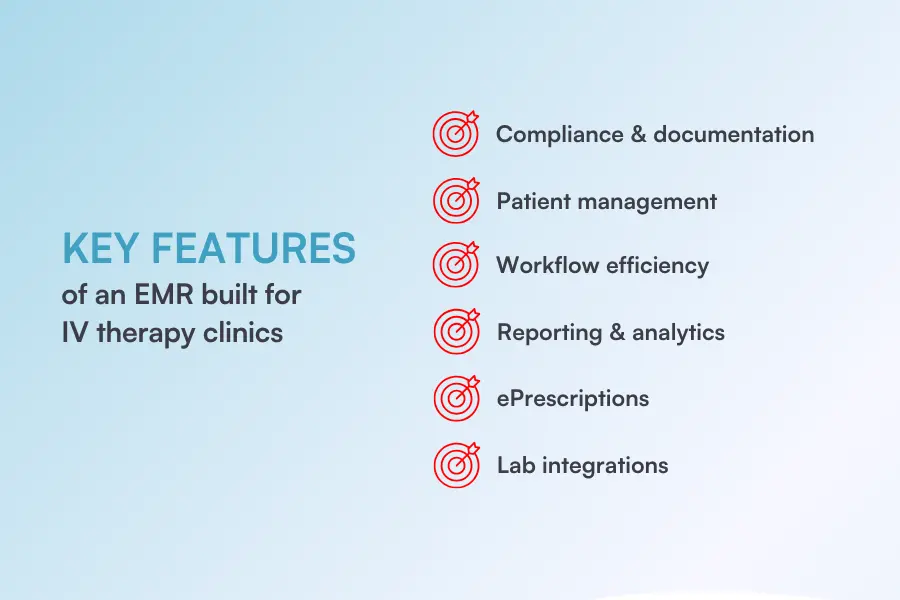 The moment a client asks about their last drip and your system freezes, you know it’s time to rethink your Electronic Medical Record (EMR).IV therapy moves quickly. Appointments overlap, stock needs monitoring, and your team has to stay aligned on dosing and protocols. If your software can’t keep up, the day becomes harder than it needs to be.A good EMR does more than store charts. It should help you:Support safe infusionsTrack stock as it’s usedKeep records clear and consistentOrganize clinic workflowsStreamline scheduling and follow-upThis guide breaks down how to choose an EMR that fits the pace of IV therapy and helps your clinic run smoothly, whether you’re upgrading or starting out. Why the right EMR matters for IV therapy clinics IV therapy is a regulated medical procedure. 💉You’re working with active ingredients, patient-specific dosing, and clinical protocols that need to be followed with precision, every single time.Can you guess what that calls for? Clear documentation and solid compliance. The thing is, most generic EMRs aren’t built for that. They’ll handle bookings and basic notes, sure. But when it comes to:Logging exactly what was infused and whenTracking doses, rates, and prescribing historyAlerting when the IV solutions run low in stockTying consent directly to the treatment provided… they fall short. That creates risk not just for your patients, but for your team and your clinic’s reputation.A purpose-built EMR solution changes that. It’s designed to improve efficiency, streamline clinical delivery, and support patient safety.In fact, a 2024 study of 591 nurses found that implementing an EMR led to a 30% drop in medication administration errors, alongside a measurable reduction in reported stress and workload. Illustration: Pabau / Source: PubMed That kind of impact doesn’t just apply in hospitals. Any time you’re delivering medical-grade treatments, your workflow matters. And the tools behind it make all the difference.⬇️ Next, let’s break down the features that make that possible. Key features of an EMR built for IV therapy You already know generic EMRs fall short when it comes to infusions, dosing, and clinical protocols. They’re not built to handle the details that IV therapy demands.A dedicated IV therapy EMR works differently. It matches how your clinic operates, supports compliance, and clears the clutter that slows your team down.These are the core features to expect in an EMR built around IV workflows 👇 Source: Pabau ⬇️ First up: compliance and documentation. Compliance and documentation tools Every IV treatment needs clear, traceable documentation without adding friction to your workflow. Look for tools that:✔️ Link digital consent forms directly to the treatment✔️ Make notes quick to complete without skipping critical steps✔️ Create time-stamped records that clearly show what was done and whenAudit trails and secure storage take the guesswork out of record‑keeping. When someone asks to see how a treatment was handled, you can show it clearly and confidently. It supports your team and makes inspections a lot smoother.And because no two clinics run the exact same protocols, customizable templates are a must. The right EMR lets you build the forms and flows that match your specific needs, not squeeze into a one-size-fits-all setup. Patient management and communication Once the records are handled, it’s about how you support your clients at every stage of their journey.That starts with having all the patient information in one place. A good EMR should show you past appointments, allergies, prescriptions, treatment notes, and lab results without needing to jump between tabs or files.It should also keep communication moving between sessions, with features that:✔️ Send automated appointment reminders✔️ Trigger follow-ups based on treatment type or timing✔️ Let clients confirm, cancel, or reschedule in a tapThe patient portal plays a big role here. When clients can log in securely, view their records, and manage bookings without waiting for a reply, it improves efficiency and drives patient engagement. They stay in the loop, feel more in control of their care, and are more likely to follow through on treatment plans.Over time, that kind of experience becomes a reason they stay loyal — and a reason they refer others. Workflow and efficiency features Everyone wants to save time and work smarter. But you can’t be efficient if your software’s dragging its feet.The right EMR supports your workflow by:Flagging no-shows and double-bookings before they derail your scheduleTracking inventory so you’re not scrambling mid-shiftGiving staff a clear view of tasks, progress, and next stepsA 2025 review in BMC Health Services Research found that Electronic Health Records (EHRs) with built-in support for workflow, customization, automation, and clean data entry led to fewer medication errors and smoother handovers. Illustration: Pabau / Source: ResearchGate Systems without those features slowed teams down and made day-to-day operations harder to manage.And while the study focused on EHRs in healthcare, the same design principles apply when choosing an EMR for an IV therapy clinic. Reporting and analytics Every clinic runs on patterns… some profitable, some not. Reporting and analytics make sure you can tell the difference.But to get real value from those insights, they need to be specific to your clinic. That’s where customized reports come in. You get answers to questions like:Which IV drips are getting repeat bookings?Which services aren’t pulling their weight?Which rooms are sitting empty too often?What stock is being overused, underused, or going to waste?Who’s delivering the most high-value treatments? Revenue and utilization reports bring the business lens into focus. You’ll see how staff time, room usage, and product costs stack up against pricing, helping you optimize what’s working an