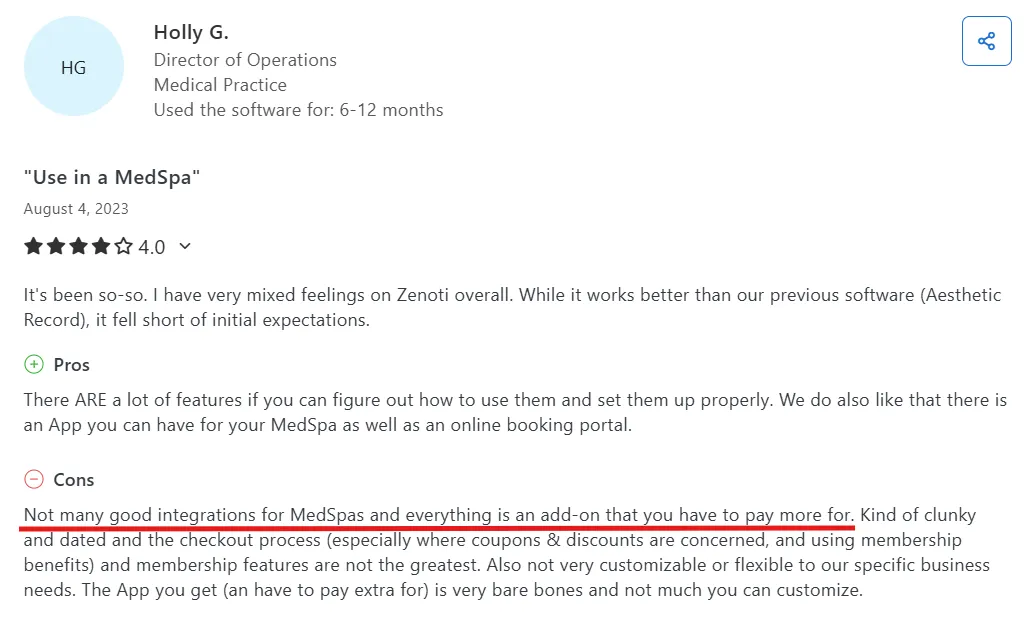“So far its been good. It still can improve with user friendliness. I think there’s great things with integrations but I feel like they are too costly to implement. I like how versatile it is and could really encompass everything that a small medspa needs.” – Leonard P., Capterra