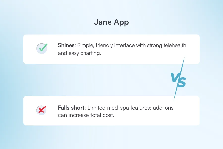 Jane App: Ideal for wellness and therapy-focused practices seeking simple scheduling, charting, and telehealth capabilities.