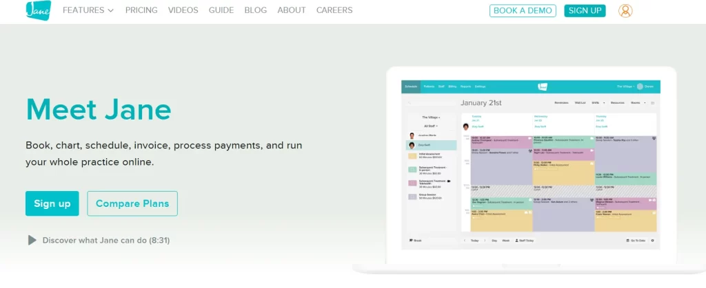 - Jane App – Perfect for wellness and therapy-focused practices. Simple, user-friendly, and telehealth-ready, it keeps your scheduling and patient communication smooth.