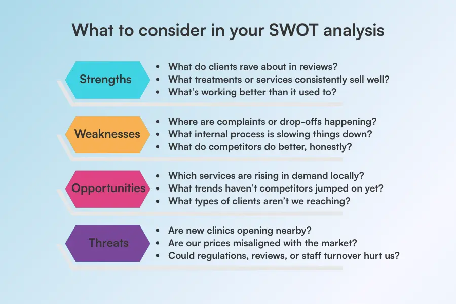 Med spa clients are savvier than ever. They scroll fast, research hard, and make decisions based on a mix of before-and-afters, Google reviews, and gut feeling.If you want to stand out, good treatments aren’t enough on their own. You also need clear answers to:✔️ What sets you apart✔️ What your audience is actively looking for✔️ Where your competitors are gaining groundThat’s where competitive analysis comes in. When done right, it helps you stop second-guessing your pricing, marketing strategies, and service approach and start making moves that drive growth.This guide breaks it all down. You’ll learn how to find your real competitors, spot what’s working for them, and turn those insights into real results. What is a competitive analysis and why does it matter for med spas Competitive analysis is about knowing what you’re up against. Not in a paranoid, binoculars-on-the-rooftop kind of way, but by understanding who else is out there, how they’re positioning themselves, and where you stand in comparison.For med spas, that kind of awareness changes everything.Because, as you probably know, the med spa industry is crowded. Everyone’s running ads, posting reels, dropping Botox promos, and fighting to outrank each other on Google. But not everyone is taking the time to do thorough market research.Competitive analysis helps you:Uncover in-demand services that other clinics haven’t leaned intoPrice confidently, with data that reflects your local marketEvaluate what promotions are working for others (and which ones are flopping)Make sure your branding is sharp and recognizableShape a seamless customer experience from booking to follow-upIt also sharpens your med spa marketing efforts, especially when it comes to keywords and local visibility. Terry Ross, founder and CEO of Terri Ross Consulting, summed it up perfectly in an AmSpa article: Illustration: Pabau / Source: AmSpa So, rather than echoing what every other clinic is doing, use what you’ve learned to carve out your edge and make it obvious why clients should pick you. How to do a competitive analysis for med spas Now that you know why competitive analysis matters, let’s talk about how to do it without getting lost in browser tabs and Instagram rabbit holes.Here’s the full breakdown at a glance: Source: Pabau Let’s break it down step by step. ⬇️ 1. Identify direct and indirect competitors Start with the obvious: Other medical spas offering similar treatments in your area. If they’re targeting the same demographics with the same services, they’re your direct competition. Easy enough.But don’t stop there.Plenty of aesthetic practices outside the traditional med spa space are pulling from the same pool of clients. Think dermatologists, plastic surgeons, or wellness providers offering overlapping services like skincare consults or dermal fillers. These are your indirect competitors, and they’re just as important to track.Ignore them, and you’re only seeing half the picture.To get a real sense of your market, dig through:Google search: Try “med spa near me,” “Botox in [your city],” or “lip filler [area]” and check who shows up in the map pack.Yelp and review platforms: Great for spotting top-rated providers and the kinds of experiences clients are talking about.Booking platforms: These often show which local clinics are active, what services they offer, and how they price them.Social media: Instagram, TikTok, and even LinkedIn give you a peek into how other clinics position themselves and how audiences respond.Your own clients and staff: They’ve seen what else is out there. Their input can tell you who else is on people’s shortlist, and why. 💡 Pro tip: Don’t treat these sources like separate boxes to tick. The real value comes when you layer the insights. One competitor might have slick branding but weak reviews. Another might have killer Search Engine Optimization (SEO) but clunky booking. Stack it all together, and the trends (and gaps) become obvious. 2. Gather information about competitors A few names on a list don’t tell you much. You need to dig in and see what your competitors are really up to. Here’s a list of questions that will help you in the process:Where are they based, and how many locations are they running?Are they single-location, franchised, or expanding into a chain?Which treatments are front and center on their website and socials?How are they pricing their services?Are they pushing memberships, bundles, or high-ticket one-offs?What social media channels are they active on, and what does their website say about their brand?Are they showing up in local search for the services you also offer?What kind of feedback are they getting in online reviews?Once you’ve got the lay of the land, you’ll know exactly where you stand. (Hey, it even rhymes!). Now, onto your SWOT. 3. Conduct a SWOT analysis A SWOT analysis is your chance to take a clear-eyed look at your business. Strengths, weaknesses, opportunities, and threats. All of it on the table.Use what you found in your competitor research to guide your thinking. For example: Source: Pabau Think of it as a pressure test. It forces you to stop running on autopilot and start thinking like someone evaluating your business from the outside. Which, spoiler alert, is exactly what your clients are doing. 4. Evaluate your business against competitors It’s time to turn the lens inward. Start with the obvious marker, using the SWOT analysis from the previous step as your guide:Is your pricing aligned with your positioning, or are you charging premium rates for a mid-tier experience?How does your brand come across online — polished, personal, forgettable?Are your treatments and packages resonating with your target audience, or are you still pushing what worked five years ago?Then look beyond what your surface-level reports show. You might have a solid client base, but few referrals. Plenty of high-quality reviews