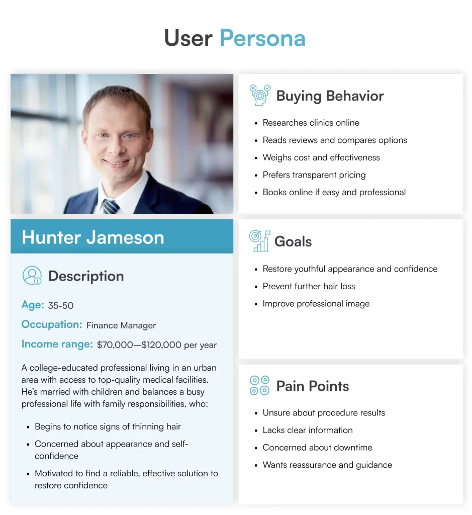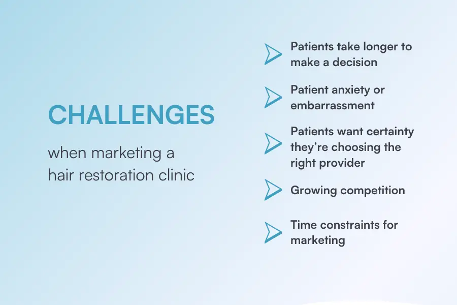 Running a successful hair restoration clinic today requires more than providing excellent treatments. To truly grow, you need to reach the people who are actively searching for solutions and convince them that your clinic is the right choice. You may feel like you are doing everything right for your patients but still losing them to competitors with louder or flashier advertising. Or perhaps you are simply unsure where to start with marketing. The good news is that effective marketing does not have to be complicated or expensive. You don’t need to hire a full-time marketer, or a marketing agency, or pour thousands into ads to see results. In this guide, we will walk through practical, easy-to-implement digital marketing strategies designed specifically for hair restoration clinics. Why marketing matters for hair restoration clinics Marketing a niche service like hair restoration comes with its own set of hurdles. Hair restoration services are high-ticket items, which means patients often take longer to make a decision. Many feel anxious or embarrassed about discussing hair loss, making it even harder for them to take the first step. Source: Pabau On top of that, trust plays a huge role. Patients want to feel certain they are choosing the right provider for such a personal investment.At the same time, competition is growing. As awareness around hair restoration increases, more clinics are entering the space, leaving many practitioners struggling to stand out. And when you are also managing treatments, patient care, and the daily operations of your clinic, finding time for marketing can feel nearly impossible.The truth is, effective marketing done right helps patients feel understood, supported, and confident in their decision to work with you. Marketing can be the bridge between someone quietly struggling with hair loss and finally finding the care they need.It essentially brings in more bookings for your clinic, while helping you deliver a better patient experience at the same time. Understanding your ideal patient persona The first step to stronger marketing is knowing exactly who you want to reach. Hair restoration patients often range from men in their 30s–50s who are noticing thinning hair to women experiencing hair loss from hormonal changes, stress, or medical conditions. Source: Pabau Their goals vary — from restoring confidence to feeling younger or addressing a long-standing insecurity with a hair transplant.When you understand these motivations, you can shape everything from your messaging to your marketing channels. A patient in their 40s weighing the cost of treatment will respond differently from someone in their 20s seeking preventative options. By tailoring your approach to your ideal patient persona, your marketing feels more personal, and far more effective. The lifetime value of a hair restoration client Hair restoration isn’t usually a one-time treatment. Patients often commit to long-term plans, rebook for maintenance sessions, or explore additional services like scalp health treatments or complementary cosmetic procedures. This makes every new patient relationship highly valuable.By investing in high-quality lead generation and retention strategies, you are filling your calendar and building trust and loyalty that pays off over time. A single patient can become a repeat client, an advocate for your clinic, and a source of referrals, making thoughtful marketing one of the most impactful investments you can make. Foundational marketing strategies every clinic needs Before diving into paid ads or influencer collaborations, you need a strong marketing foundation. Digital marketing success starts with consistent visibility and building trust with potential patients online. These core strategies ensure your clinic is discoverable, credible, and ready to convert interest into bookings. Local SEO and Google Business profile When someone searches ‘hair restoration near me,’ you want your clinic to appear at the top of the results. Implementing search engine optimization (SEO) and optimizing your Google Business Profile make boosting your online presence possible.Here are a few steps to help you get started with your Google Business Profile:Add accurate contact details, up-to-date business hours, and location information.Upload high-quality before-and-after photos to showcase your work.Encourage happy patients to leave reviews — clinics with strong ratings are far more likely to attract new bookings.In fact, nearly 84% of patients check online reviews before choosing a provider, making this one of the most impactful areas to focus on for improving your visibility and rankings. A user-friendly, mobile-optimized website Your website is often a patient’s first impression of your clinic, and it should inspire confidence right away. A good clinic site loads quickly, is easy to navigate, and looks great on mobile devices (where most people are searching). Trust signals like testimonials, certifications, and professional bios reassure visitors they are in good hands. And most importantly — booking should be effortless. With 80% of patients now saying that online scheduling influences their choice of provider, a clear, streamlined booking form can make the difference between a new patient and a missed opportunity. In fact, 24% of them will look for other options if booking an appointment isn’t as easy as making a dinner reservation. Social media presence and content marketing Social media marketing is one of the most powerful tools for showcasing your results and humanizing your clinic. Social media platforms like Instagram, TikTok, and Facebook let you educate, inspire, and connect with potential clients where they are already spending time. Share content such as time-lapse treatment videos, FAQs about procedures, or real client success stories. This helps you build credibility and helps patients feel more comfortable reaching out. Consistency is key, so regular p