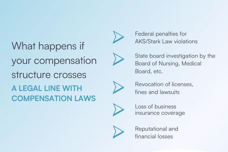 Compensating your med spa team sounds simple until you factor in federal and state laws. While it’s natural to want to reward staff with bonuses or commissions, many med spa owners don’t realize that certain compensation structures can cross legal lines.A common misconception among medical spa owners is that paying providers a percentage of revenue is always allowed, but depending on your state, it could land you in trouble.Navigating these laws is essential to avoid penalties and ensure your practice stays compliant.Disclaimer: This article offers a general overview of compensation compliance for med spas. It’s not legal advice, and we strongly recommend speaking with a qualified healthcare attorney before finalizing your pay structures. Why is it important to be compliant with compensation laws for med spas Unlike traditional spas or salons, med spas offer both aesthetic and wellness treatments and perform medical procedures.Many medical spas operate under a hybrid of cosmetic and medical services, so the rules around how you pay your med spa employees can be more complex than in a typical salon or spa business, especially regarding commission-based compensation.If your compensation model doesn’t comply with state and federal regulations, the consequences can be serious: Source: Pabau Violating compensation laws can lead to serious consequences. The risks are real, including steep federal penalties, such as violating the Anti-Kickback Statute, which can result in up to 10 years in prison and up to $100,000 per violation. Even if you avoid legal action, reputational damage alone can take years to recover from.That’s why it’s important to approach this term with caution and be sure your compensation model aligns with healthcare and medical aesthetic regulations.When this happens, often it’s not a matter of bad intent, but just a misunderstanding of the rules. 💡 Important: The word “commissions” tends to raise a red flag in the medical spa industry. It’s often linked to compliance issues, so use it carefully and sparingly when talking about compensation for medical professionals and healthcare providers. Federal laws impacting med spa compensation Now that you know why it’s important to be compliant (and what happens if you’re not), let’s understand the federal and state laws that set the foundation for how med spas can structure compensation. The Anti-Kickback Statute (AKS) The Anti-Kickback Statute (AKS) prohibits offering, paying, soliciting, or receiving anything of value in exchange for referrals related to services covered by federal healthcare programs like Medicare or Medicaid.Simply put, if a company offers compensation to healthcare professionals for using or referring its products or services, which are paid under the healthcare programs, it’s considered fraud.This is because compensating a provider in this way could influence their medical judgment or encourage unnecessary services.Even if your med spa is private pay and doesn’t bill federal programs, don’t disregard it. Some states have versions of this law that apply more broadly, regardless of who’s footing the bill.That means, depending on where you operate, something as simple as a referral bonus or commission tied to medical treatments could be a violation. 💡 Pro tip: Because the rules around AKS can be complex and vary by location, it’s essential to consult with a healthcare attorney before putting any referral or incentive-based compensation model in place. The Stark Law (Physician Self-Referral Law) The Stark Law, also known as the Physician Self-Referral Law, kicks in when a physician refers a patient to a healthcare service or facility in which they (or a family member) have a financial interest, such as ownership, investment, or even a compensation agreement.The goal of the law is to prevent physicians from making referrals based on financial gain instead of what’s best for the patient.For med spas offering purely cosmetic, self-pay services (like Botox, fillers, or laser hair removal), the Stark Law might not be a big concern.But the Stark Law can come into play if your medical practice or med spa: Bills insurance for services like acne treatments, dermatology procedures, or medically necessary laser therapiesOffers medical services covered by federal programsReceives patient referrals from MDs or licensed physicians for things like skin condition management or post-surgical scar treatmentWhen in doubt, always check with a healthcare attorney to make sure your referral and ownership arrangements are compliant. State-level laws impacting med spa compensation Now that we’ve covered the federal compensation laws, let’s look at state regulations and laws governing how medical spa owners can pay their staff.Each state has its own rules when it comes to things like the medical scope of practice, fee splitting and whether or not commissions are allowed for medical treatments.Some state-specific laws mirror the Anti-Kickback law, while others are stricter, even applying rules to med spa services not covered by insurance. Source: Pabau These laws vary widely, so it’s important to understand the specific requirements in the state you operate, especially if you plan on opening a practice in another state. Fee-splitting laws All states have a version of the fee-splitting law, but their interpretation and implementation may vary.Fee-splitting, in essence, means that the revenue from medical services can’t be split with unlicensed individuals or non-medical entities.Where fee-splitting can get tricky for med spasLet’s say a med spa offers Botox treatments and pays a percentage of the revenue from each treatment to a non-medical business owner, partner, or front desk staff member who isn’t a licensed medical provider. That kind of arrangement could be seen as fee-splitting, and in many states, it can lead to legal trouble.Even licensed estheticians can fall under fee-splitt