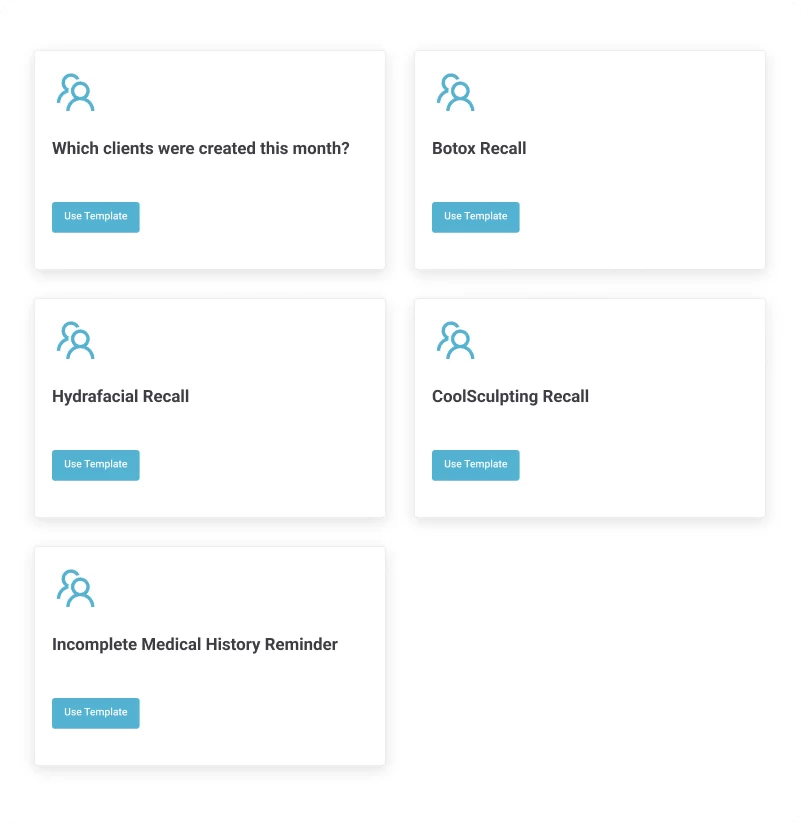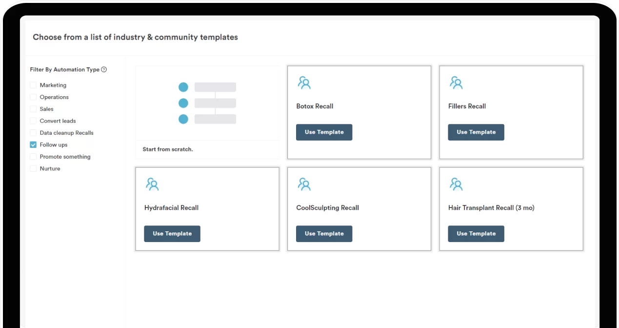 Create your automations from scratch or choose from our library of pre-built templates. With out-of-the-box automations such as Botox recall and incomplete medical history reminders, it’s really simple to get started.