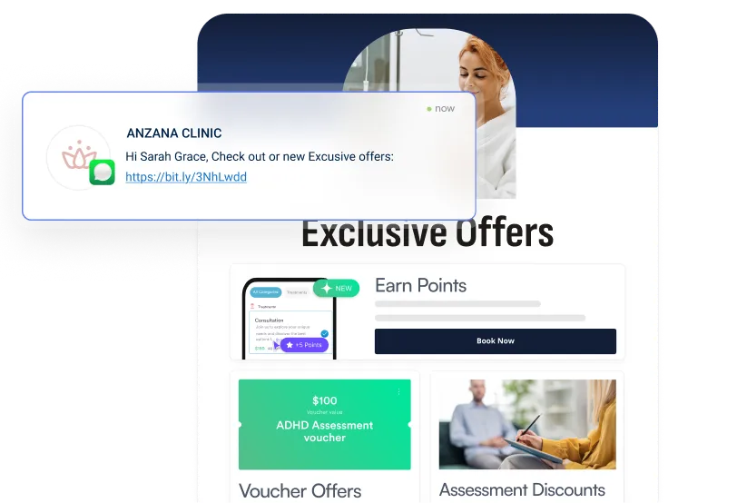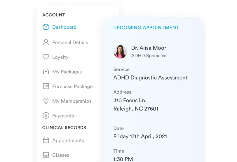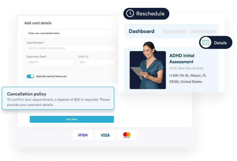 Send digital intake forms, psychiatric medical history questionnaires, and tools like the Adult Self-Report Scale automatically when patients book — so paperwork is done before they walk in.