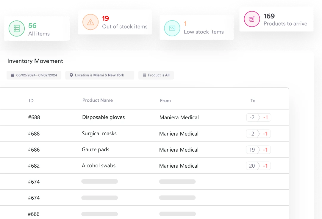 Stock tracking monitors levels in real time, sets reorder alerts, and logs usage automatically.