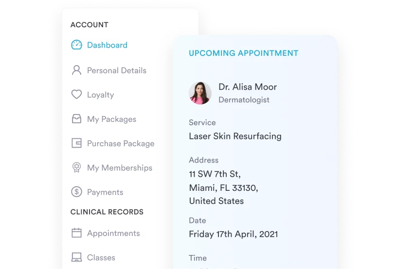 Clients can view treatment history, book follow-up sessions, pay balances, and access their before-and-after photos through a secure patient portal.
