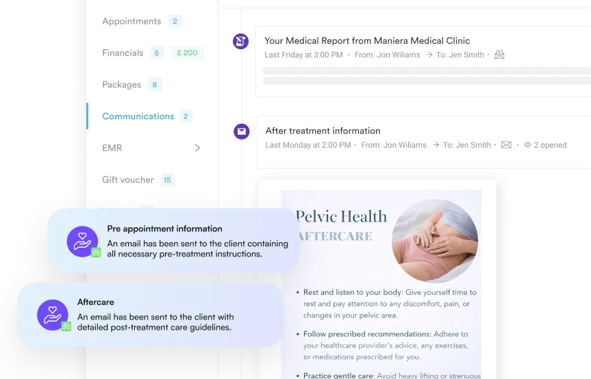 Through automatic aftercare, give clients access to a home exercise library including pelvic floor muscle exercise videos, ensuring they stay on track between visits.