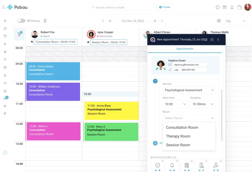 Multidisciplinary practices benefit from a centralized calendar that manages clinical tasks and availability for psychologists, psychiatrists, and counselors in one view.